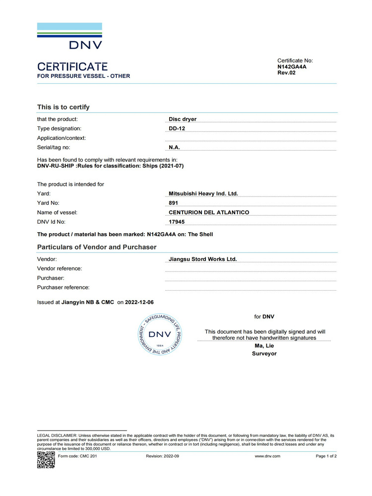 CertificationDD-12 圓盤干燥機(jī) DNV 船級(jí)社認(rèn)證證書