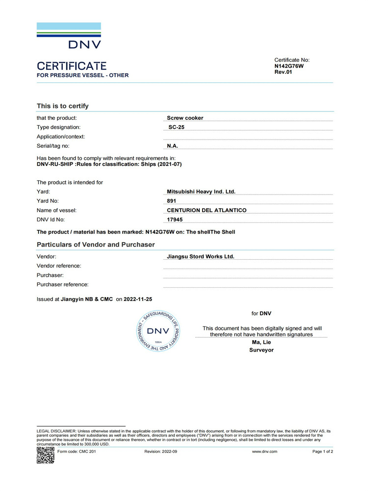 SC-25 蒸煮器 DNV船級(jí)社認(rèn)證證書