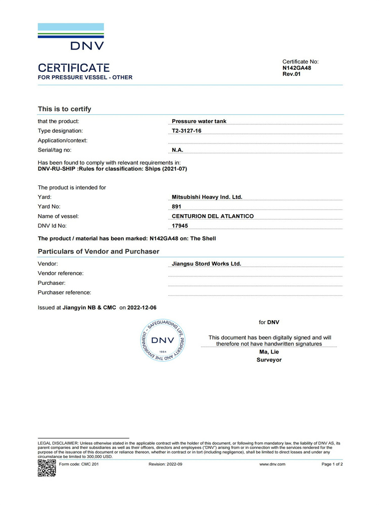 不銹鋼壓力罐 DNV船級(jí)社認(rèn)證證書