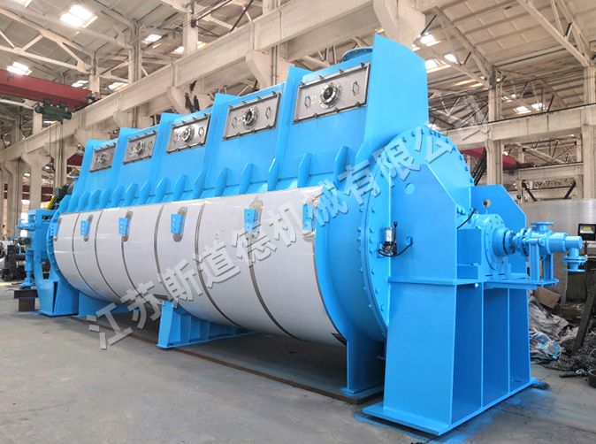 ?? PSD型圓盤式干燥機不僅外殼可進行加熱,同時內(nèi)部轉(zhuǎn)子也進行加熱,大大增加了干燥面積,提高熱效率,確保物料徹底干燥。干燥機是由一個橫臥的外殼和一個帶有加熱的轉(zhuǎn)子所組成,轉(zhuǎn)子上安裝多個加熱盤片,盤片上裝有可調(diào)節(jié)角度的推料器,在工作時既能加熱物料,又可將物料沿出料端方向推進。轉(zhuǎn)軸內(nèi)部的蒸汽分布裝置能使蒸汽均勻地分布到每一件加熱盤片內(nèi),蒸汽在盤片內(nèi)流動,使加熱盤片保持恒定的溫度,冷凝水通過軸端特殊的裝置排出。該設(shè)備干燥效率高,使用壽命長,維修頻率低。廣泛用于市政污泥、工業(yè)污泥、動物蛋白、植物蛋白、食品、化工、農(nóng)藥等高含水量和高粘度物料的干燥,根據(jù)不同的物料物性,材質(zhì)可選用碳鋼、304、316L、2205等。