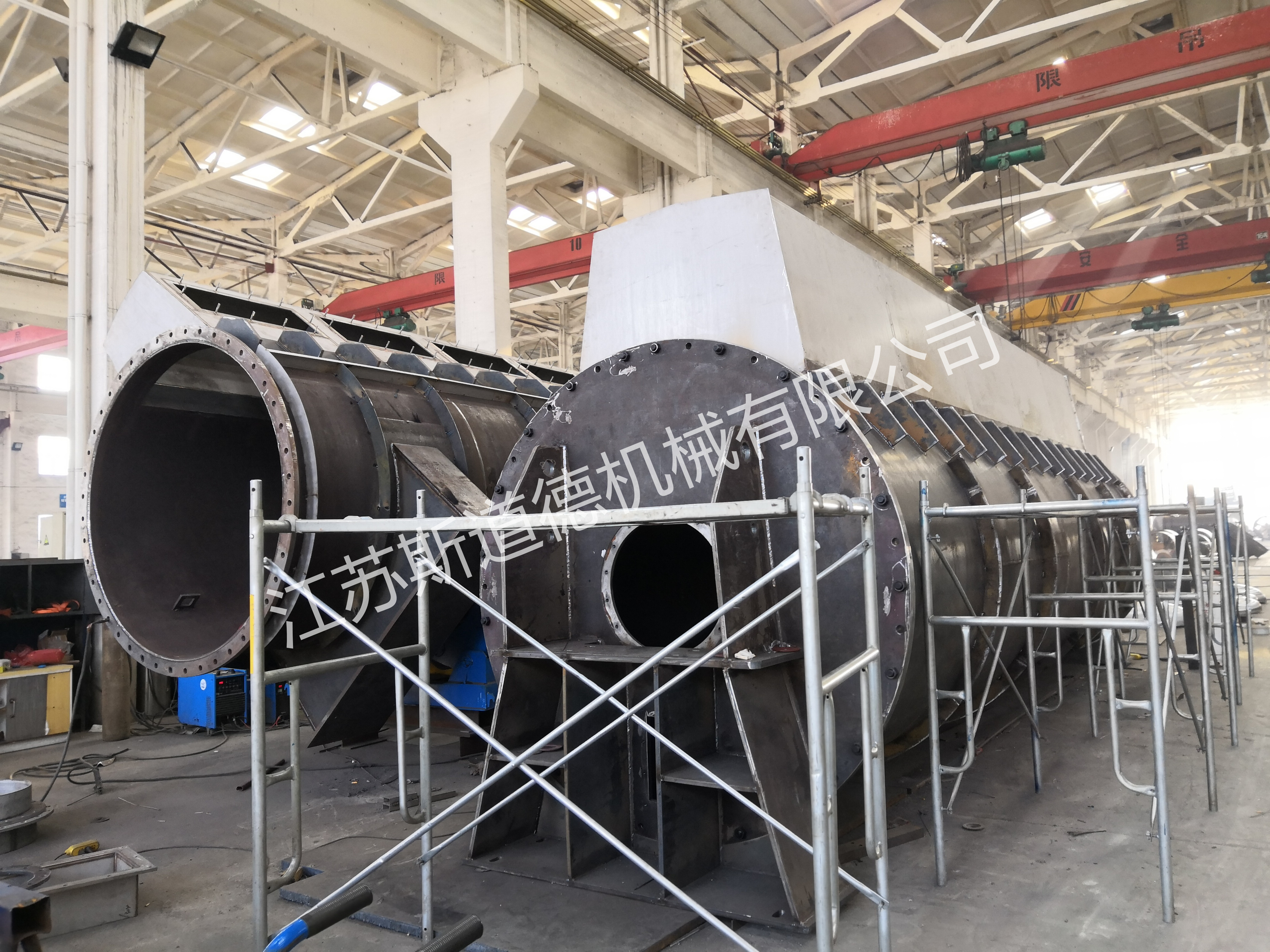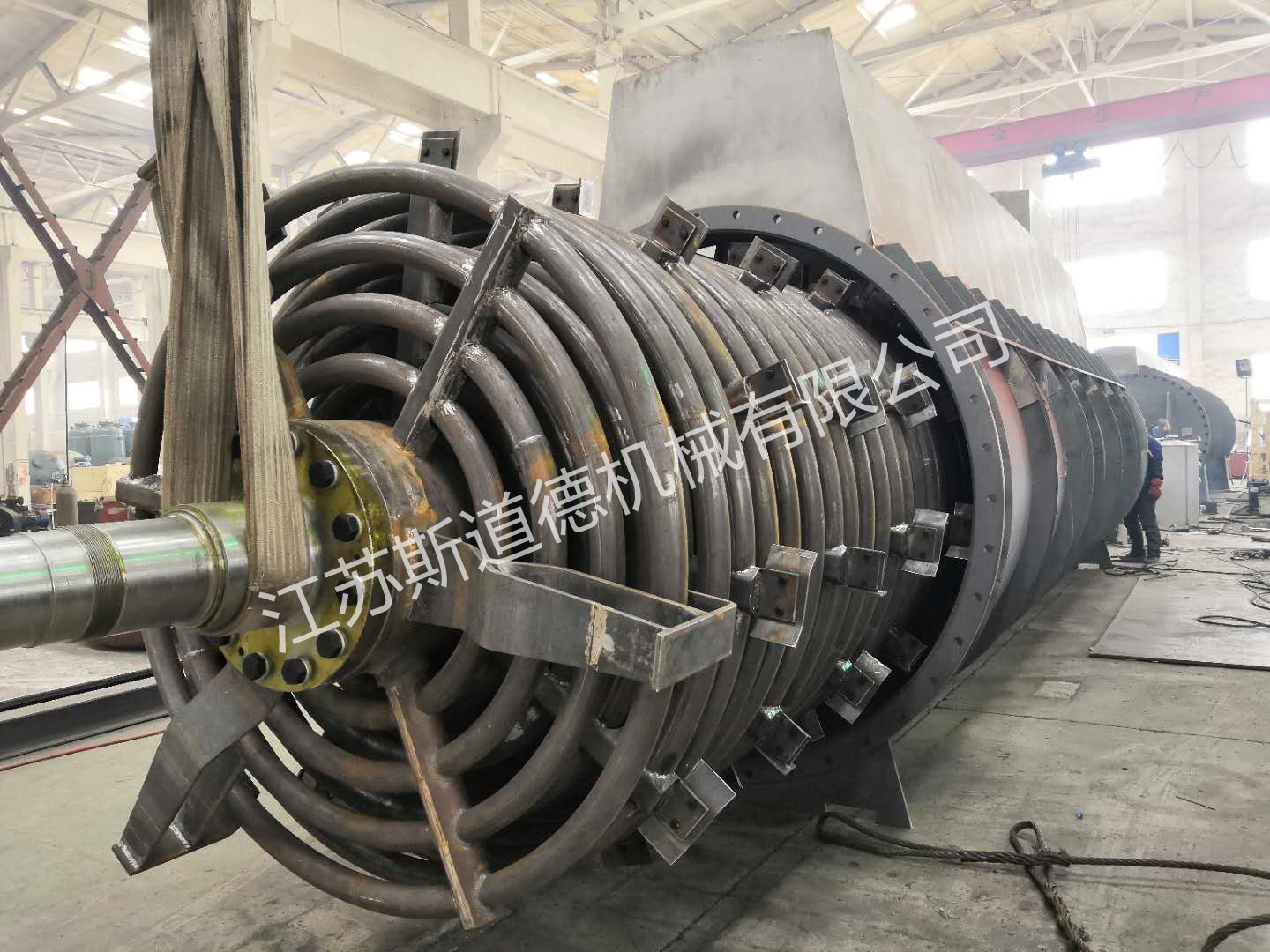 ?? PGD型盤管式干燥機不僅外殼可進行加熱,同時內(nèi)部轉(zhuǎn)子也進行加熱,大大增加了干燥面積,提高熱效率,確保物料徹底干燥。干燥機是由一個橫臥的外殼和一個帶有多套加熱管的轉(zhuǎn)子所組成,轉(zhuǎn)子上安裝多個加熱管,管上裝有可調(diào)節(jié)角度的推料器,在工作時既能加熱物料,又可將物料沿出料端方向推進。轉(zhuǎn)軸內(nèi)部的蒸汽分布裝置能使蒸汽均勻地分布到每一件加熱盤管內(nèi),蒸汽在盤管內(nèi)流動,使加熱盤管保持恒定的溫度,冷凝水通過軸端特殊的裝置排出。